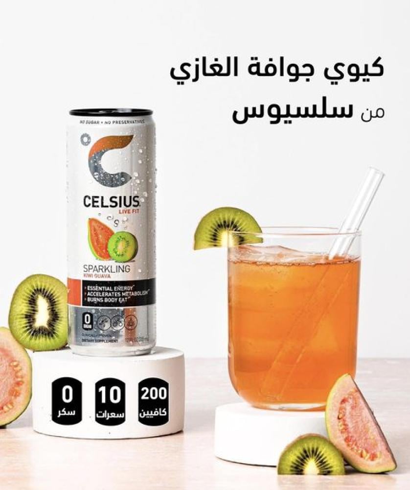 مشروب الطاقة الاساسية بنكهة الكيوي والجوافة الفوارة من سيلسيوس، مشروب مكمل غذائي 355 مل